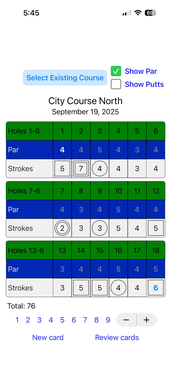 For strokes (and putts), tap the area you want to fill in. The number will be blue and bold. You can tap a number from the bottom to fill in the strokes or putts and you can increment or decrement the number with the +- stepper.