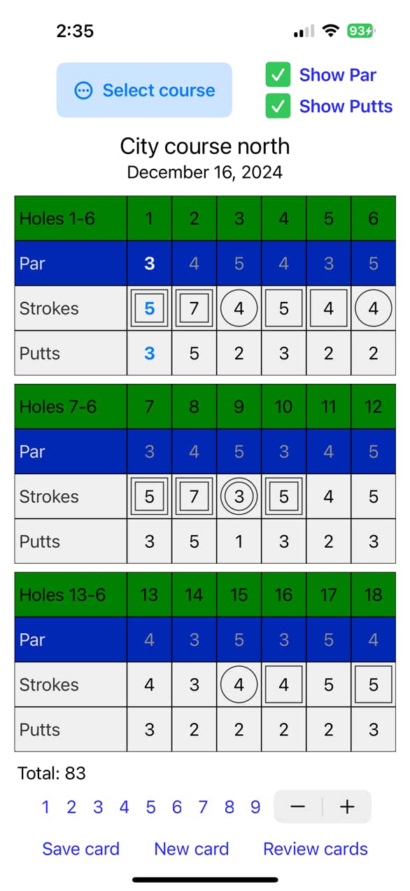 For strokes (and putts), tap the area you want to fill in. The number will be blue and bold. You can tap a number from the bottom to fill in the strokes or putts and you can increment or decrement the number with the +- stepper.